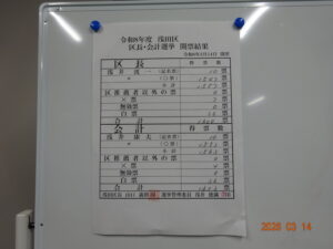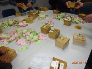 令和8年度の新区長・新会計選挙投票をありがとうございました。開票を3月14日(土)浅田区民会館2階会議室にて17時より、選挙管理委員のもと、区長・会計・区議員により実施しましたので選挙結果の報告を致します。